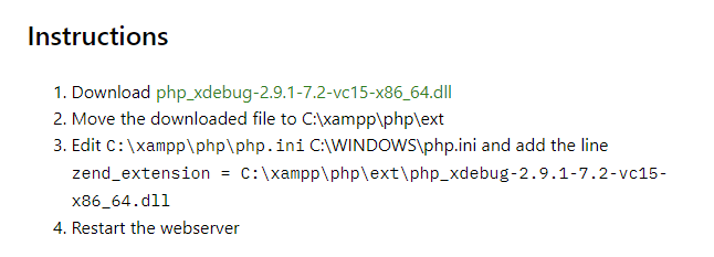 9. 아래 내용대로 php.ini파일을 수정합니다.(경로는 6번 그림의 내용 중 3번을 복사하고 나머지 내용은 직접 입력하거나 2번 내용의 그림에서 vscode에서 php debug 설치하던 상세 내용을 복사하여 넣으면 됩니다.