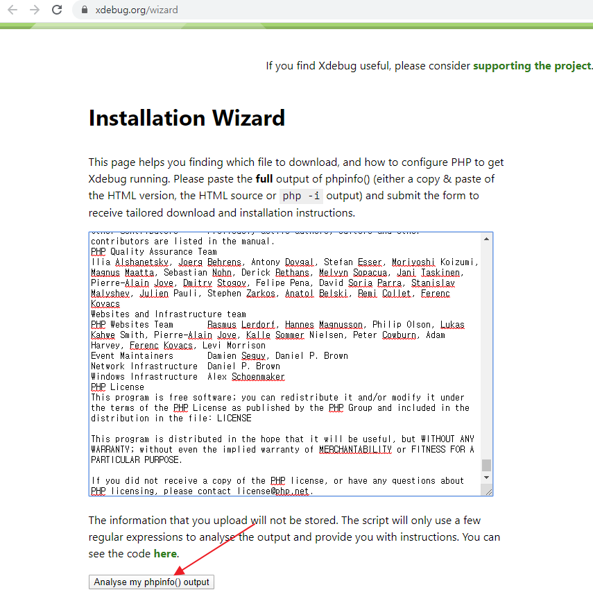 5. xdebug.org/wizard 페이지의 Installation Wizard의 텍스트 박스에 복사한 내용을 붙여 넣기 합니다.