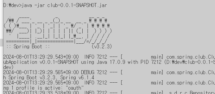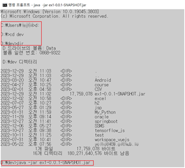 4) java -jar ex1-0.0.1-SNAPSHOT.jar -----> .jar파일 실행하기