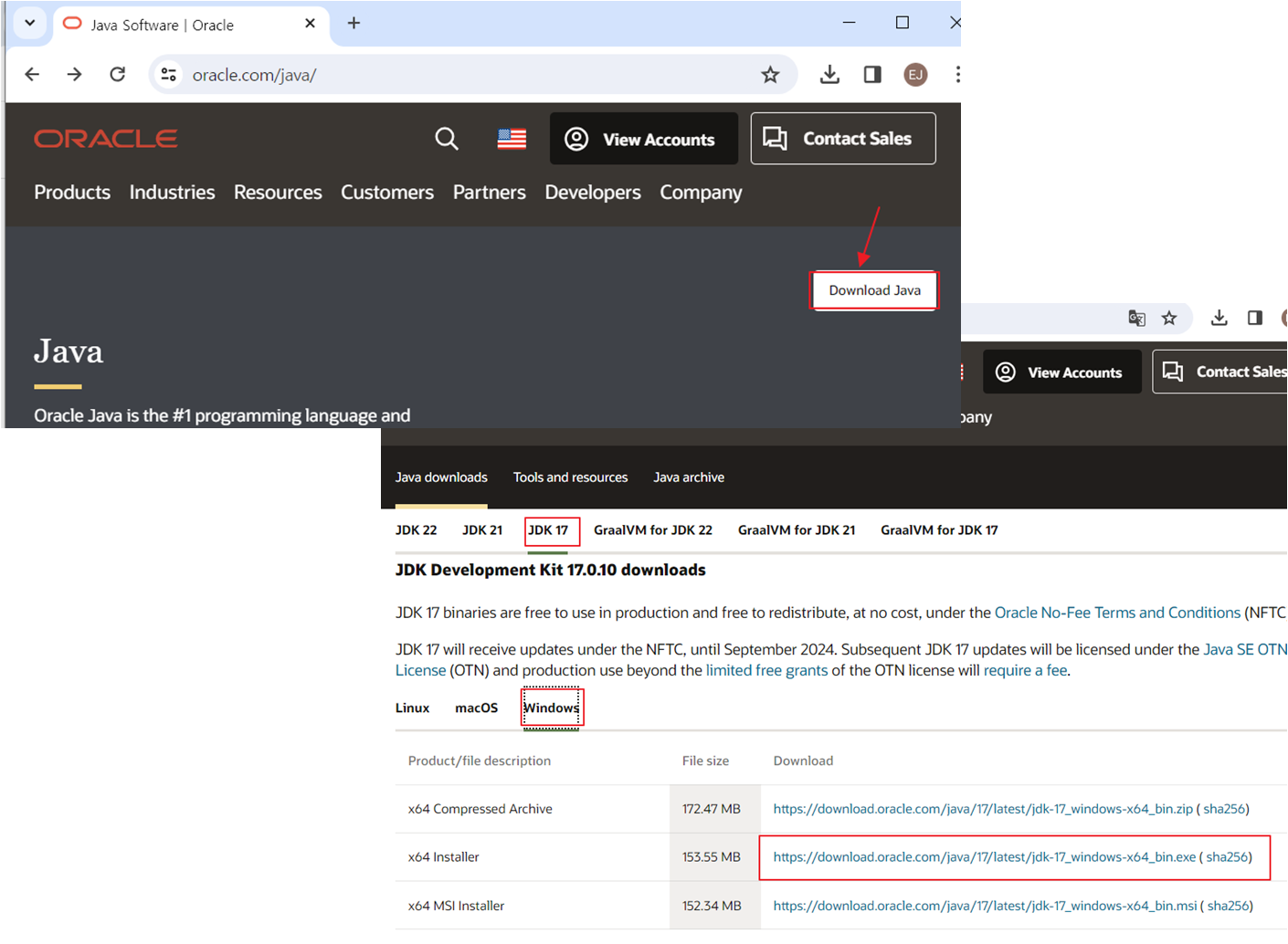 - [Download Java] > [JDK 17] 탭 > [JDK Development Kit 17.0.10 downloads]